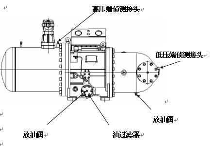 2.壓縮機(jī)的潤滑油,從油過濾器上的放油閥處放出,潤滑油接近放完時(shí),從壓縮機(jī)的高壓端偵測接頭處,注入一定壓力的氮?dú)猓?/span>1.0MPa左右),用壓力加快潤滑油排出,停止注入氮?dú)?,關(guān)閉放油閥。然后將壓縮機(jī)的油過濾器拆卸下來,將油槽里的潤滑油全部放出來,再將油過濾器清洗后裝上緊固。如圖所示: